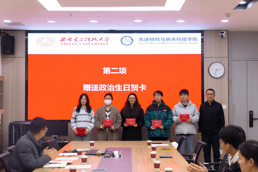 活动伊始,在学生党员李佳泽同志的领誓下,全体党员面向党旗庄严列队,重温入党誓词。铿锵有力的誓言回荡在会议室中,既是对入党初心的回溯,也是对使命担当的重申,让每一位党员再次接受了深刻的党性教育和精神洗礼。随后,朱文凯为党员代表颁发“政治生日”贺卡,勉励大家牢记党员身份,永葆政治本色,在学习和生活中发挥先锋模范作用,进一步强化了学生党员的身份认同感、责任感和使命感。