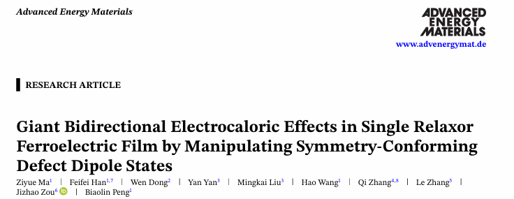相关研究成果以“Giant Bidirectional Electrocaloric Effects in Single Relaxor Ferroelectric Film by Manipulating Symmetry-Conforming Defect Dipole States”为题,发表于材料领域顶级期刊《Advanced Energy Materials》 (2025年影响因子26.8)。H动漫
