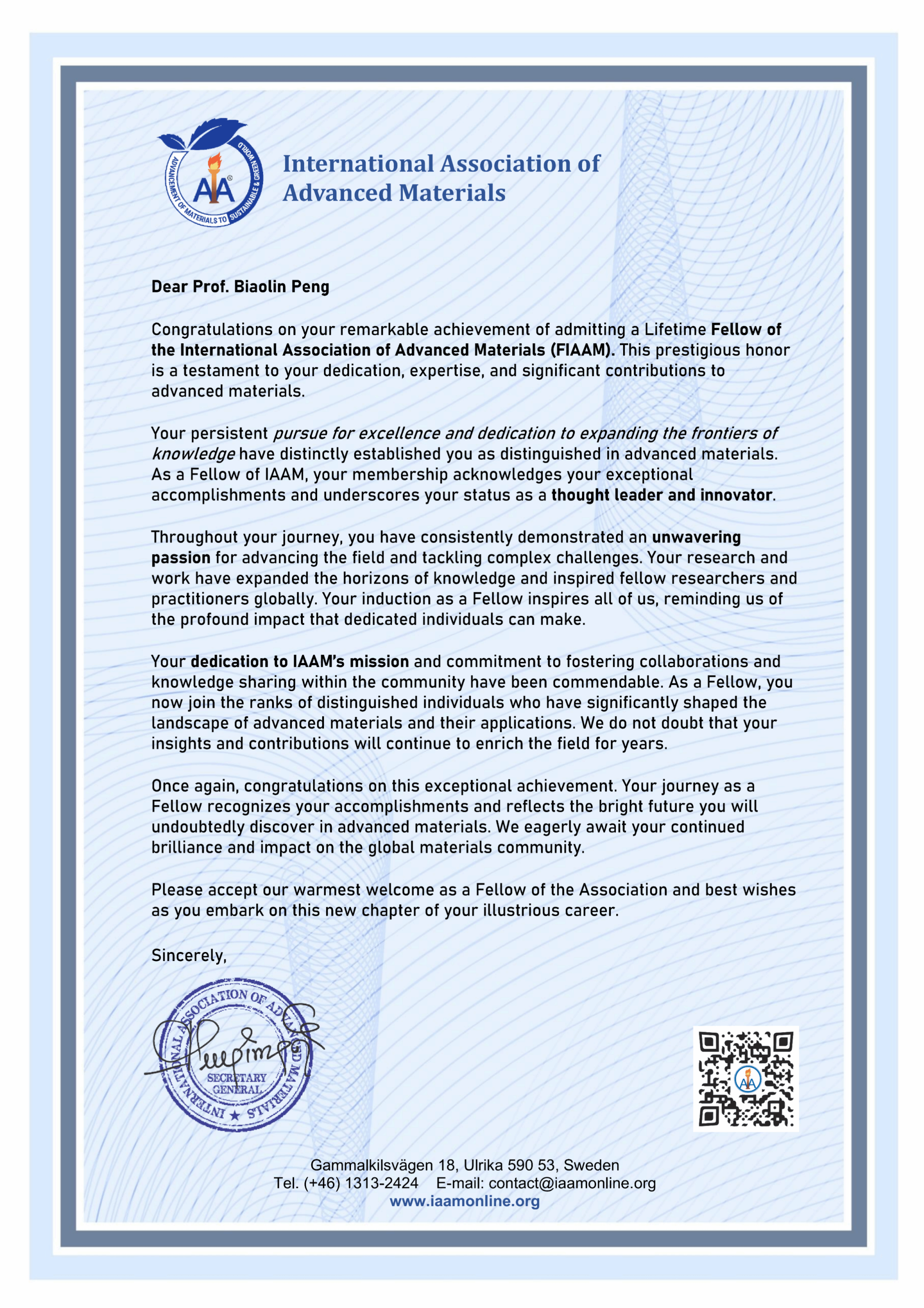 国际先进材料学会(IAAM)成立于2010年,总部位于瑞典斯德哥尔摩,是先进材料领域具有重要国际影响力的学术组织,致力于推动材料科学、工程与技术的创新发展,并搭建高水平国际学术交流平台。IAAM终身会士是该学会授予全球科学家的崇高荣誉,旨在表彰在材料科学、工程和技术领域作出原创性和重要贡献的杰出科研人员。该荣誉的遴选程序极为严格,需经过专家提名、学术委员会评审和学术演讲等多个环节,每年在每个学科仅评选不超过3名科学家。获此殊荣的学者被授权使用“FIAAM”荣誉称谓,以彰显其在材料科学领域的卓越地位。